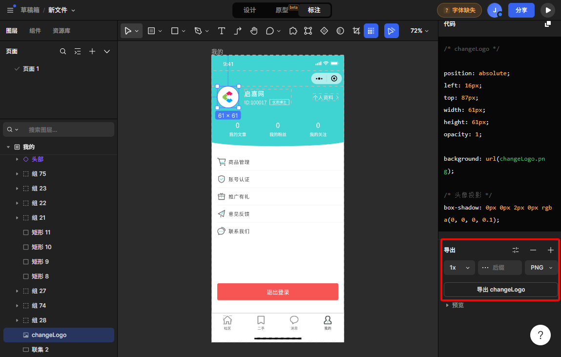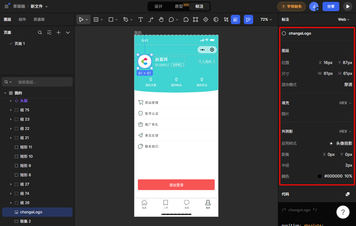 打开在线设计图,点击选择设计图其中的一个元素,页面右侧信息栏则会出现元素的样式信息,比如宽高、背景色、文字颜色、位置等等。